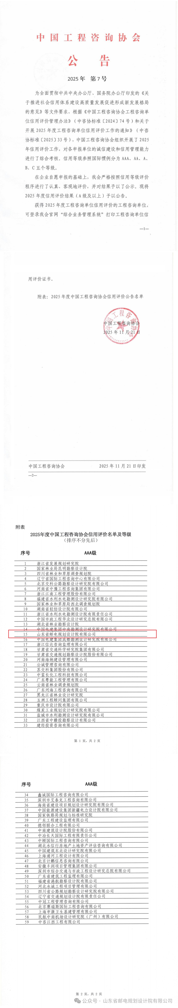 近日,中国工程咨询协会正式发布2025年度工程咨询单位信用评价结果公告,公司成功获评AAA级信用企业,这是行业对公司诚信经营理念与综合服务能力的认可。